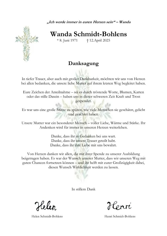 Liebe Wanda, es ist für mich so unbegreiflich, daß du nicht mehr da bist. Du hast mir aus deinem letzten Urlaub noch Bilder von deinen beiden Kindern per WhatsApp geschickt. Es war eine so schöne Stimmung. Auch die Zeit in Timmendorf-Niendorf war wunderschön. Ich vermisse dich sehr. Deine Fröhlichkeit und Herzlichkeit.
